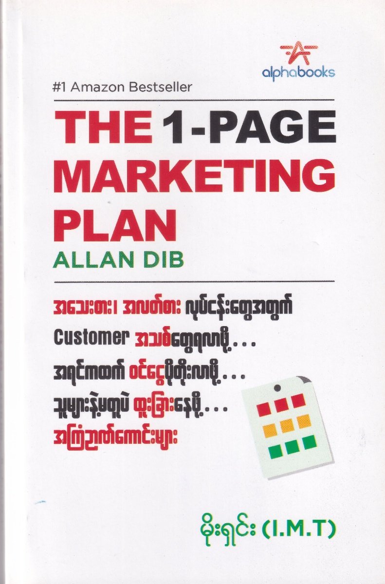 ဒီစာအုပ်ထဲမှာ သင်ဖတ်ရမယ့် အကြောင်း အရာတွေကတော့... Customer အသစ်တွေရအောင် ဘယ်လိုလုပ် မလဲ၊ လက်ရှိ Customer တွေဆီကနေ အကျိုး အမြတ်ရအောင် ဘယ်လိုလုပ်မလဲ။ လုပ်ငန်းကြီးတွေလုပ်တဲ့ Marketing ပုံစံလိုက် လုပ်တာဟာ သင့်ရဲ့လုပ်ငန်းအတွက် ဘာလို့ အန္တရာယ်များတာလဲ။ အသေးစား၊ အလတ်စား လုပ်ငန်းတွေအတွက် တကယ်အလုပ်ဖြစ်တဲ့ Strategy တွေကရောဘာတွေလဲ။ ဧ ဖိအားပေးတဲ့ပုံစံမပေါက်ပဲ အရောင်းအဝယ်ဖြစ် အောင် ဘယ်လိုလုပ်မလဲ။ တစ်မျက်နှာပဲရှိတဲ့ သင့်စိတ်ကြိုက် Marketing Plan တစ်ခုကို တစ်ဆင့်ချင်း ဘယ်လိုဖန်တီး မလဲ။ ဒီစာအုပ်ထဲကစာတွေဖတ်ပြီး The 1-Page Marketing Plan ဖြည့်သွားရုံပါပဲ။ ပြိုင်ဘက်တွေထက် အမြဲသာဓနအောင် ဘာတွေ လုပ်မလဲ။ Direct Response Marketing ဘတ်ဂျက်နည်းနည်းနဲ့ ရလဒ်ကောင်းကောင်း ထွက်အောင် ဘယ်လိုလုပ်မလဲ။ * သင့်ကုန်ပစ္စည်း (သို့)ဝန်ဆောင်မှုအတွက် ဈေးနှုန်း ကိုဘယ်လိုတင်မလဲ။